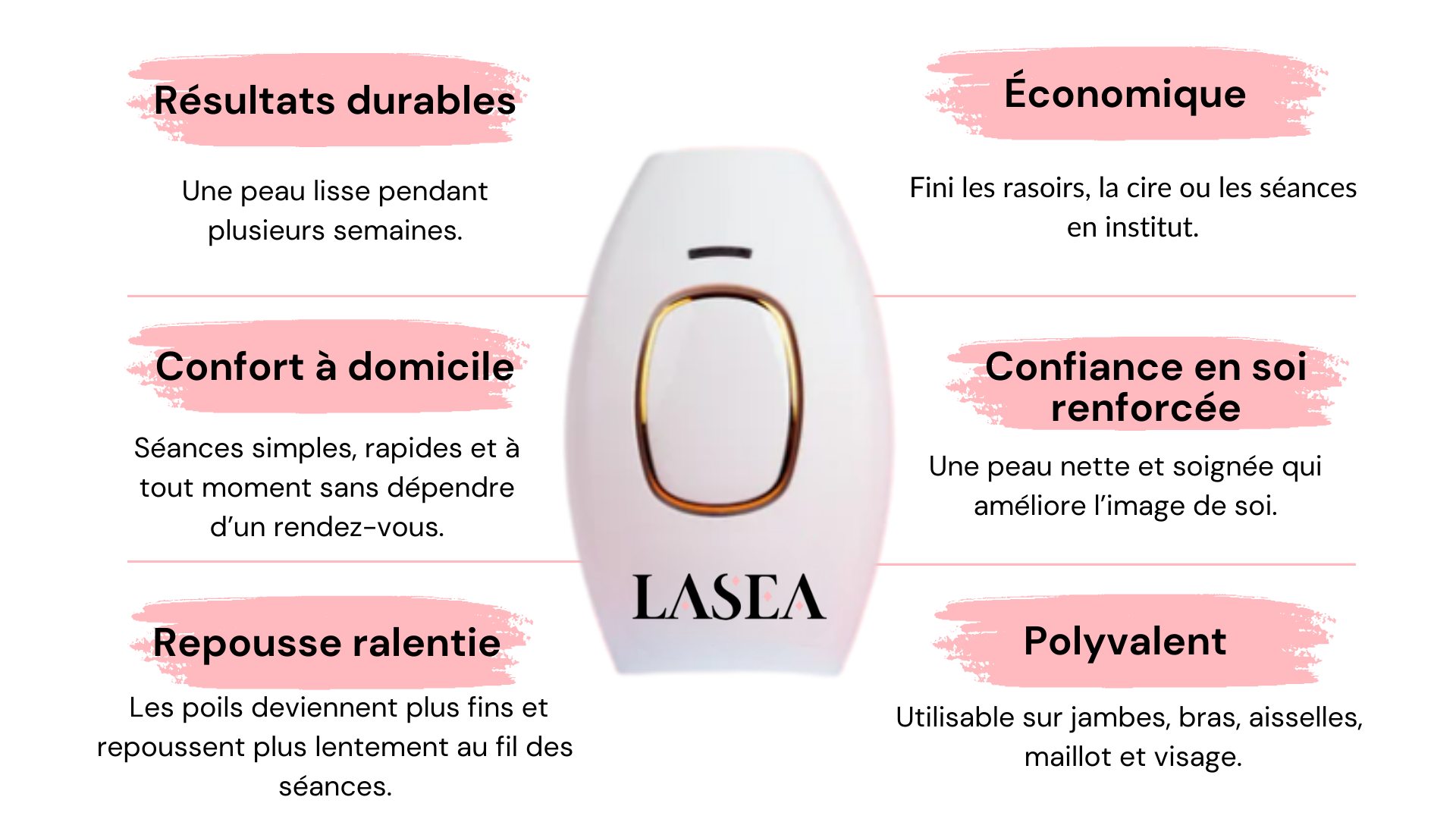 L'épilateur à lumière pulsée LASEA PRO 2.0 émet une lumière dite à large spectre, qui est envoyée à la racine du poil entraînant sa chute naturelle et à terme une quasi non-repousse de celui-ci. Selon les peaux, on peut obtenir jusqu’à 92% de réduction de la pilosité de façon définitive.
